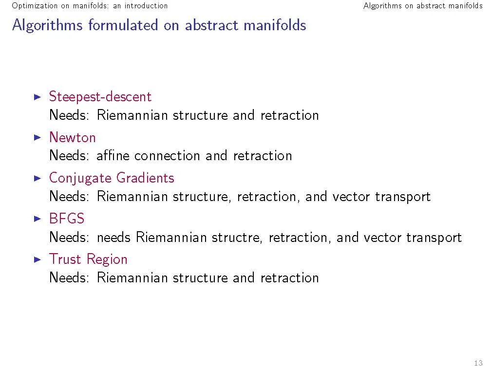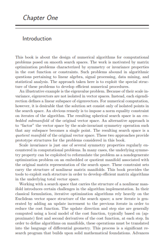 科学和工程中的许多问题都可以换种说法,即具有流形结构的矩阵搜索空间的优化问题。这本书展示了如何利用这些问题的特殊结构来开发有效的数值算法。它把重点放在了算法的数值公式和它的微分几何抽象上——说明好的算法是如何从微分几何、优化和数值分析的洞察力中同等地得出的。另外两个理论章节为读者提供了算法发展所必需的微分几何背景。在其他章节中,几个著名的优化方法,如最速下降法和共轭梯度法被推广到抽象流形。这本书提供了这些方法中的每一个的一般发展,建立在几何章节的材料上。然后,它指导读者通过计算,把这些几何公式的方法变成具体的数值算法。在数值线性代数中特征空间问题的选择问题中,所给出的最先进的算法与现有的最佳算法是有竞争力的。