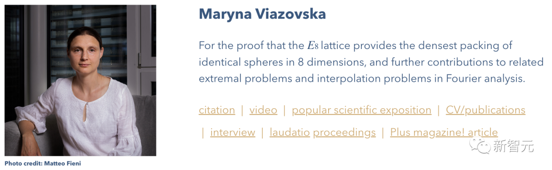 1984年,Maryna Viazovska出生于乌克兰基辅。本科毕业于基辅大学数学系,硕士毕业于德国凯泽斯劳滕工业大学,博士毕业于波恩大学马普数学研究所。曾获得塞勒姆奖、数学新视野奖、费马奖等国际大奖。