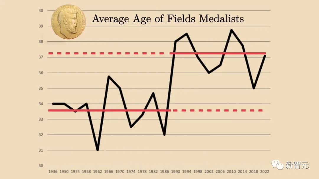 另外,十分有趣的是,在过去30年里,菲尔兹奖获得者的平均年龄增加了不少。
