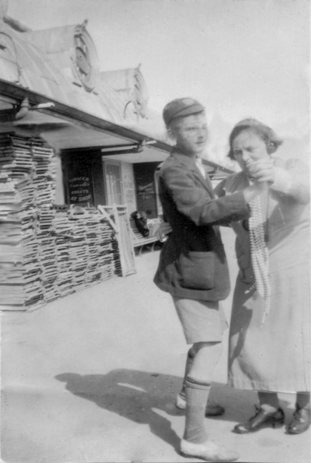 在上中学后,我有一位朋友,西里尔·琼斯,他的父母有一辆汽车。有一次,我们开车前往图德利,去看黛西姑姑,她是父亲的另一个姊妹。她和她的丈夫租种了一小块田地,但收成看上去并不好。在这之后不久,她的丈夫故去,黛西姑姑便搬过来与我们同住。她也失聪,但不是全聋,她还戴了一个非常原始的助听器。她喜欢跳舞,而我常常被她拉来当舞伴(图1.5)。像我的父亲一样,她也是一个非常乐观的人,喜欢弹奏钢琴和唱歌。