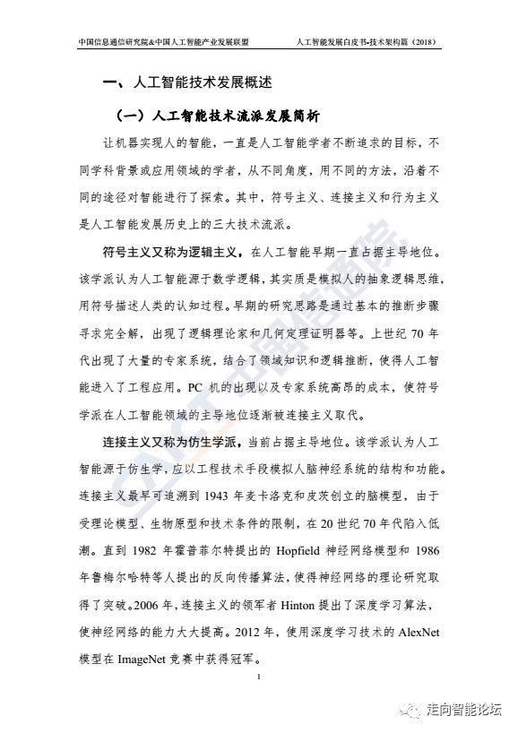 近日,中国信通院与中国人工智能产业发展联盟在2018中国人工智能峰会上首次联合发布研究成果《2018人工智能发展白皮书-技术架构篇》。白皮书回顾了人工智能发展的技术历史,围绕算法,数据和算力,系统梳理了基于深度学习的智能语音,计算机视觉,自然语言理解这三大基础应用技术及其发展的现状、应用领域,以及发展问题和趋势。以下为白皮书主要内容,供大家学习交流。本文来自:中国信息通信研究院CAICT,经授权由《走向智能论坛》公号推荐阅读。