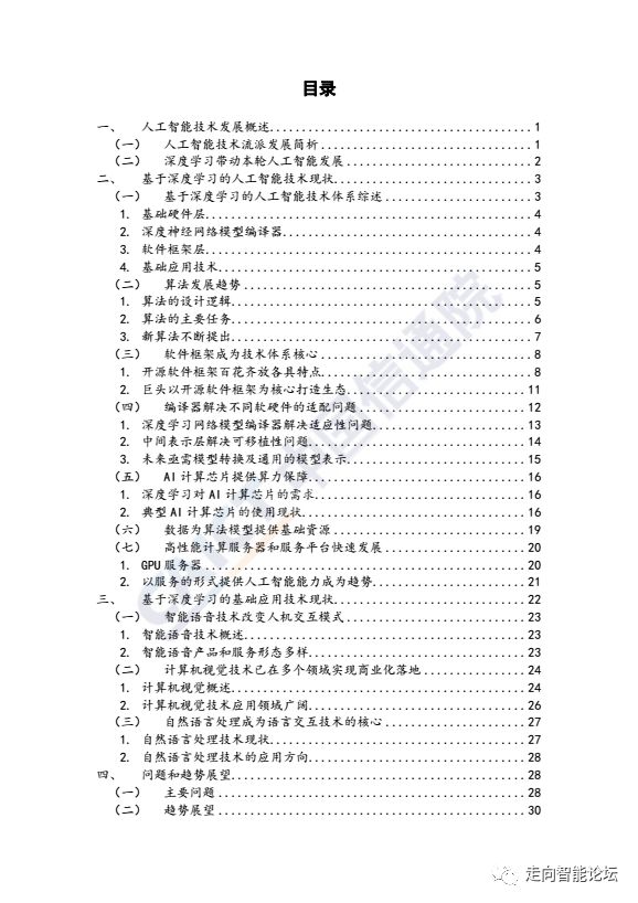 白皮书选择以深度学习算法驱动的人工智能技术为主线,第一,对人工智能发展的技术历史进行了简单回顾,阐述了深度学习带动本轮人工智能产业发展的根本原因;第二,围绕算法,数据和算力的“三驾马车”,分析了机器学习算法、AI加速芯片、训练及推断数据、软件框架、编译器等基础技术的基本情况、现状和特点;第三,系统梳理了基于深度学习的智能语音,计算机视觉,自然语言理解这三大基础应用技术及其发展的现状、应用领域。第四,提出了目前基于深度学习的人工智能技术发展问题和趋势。