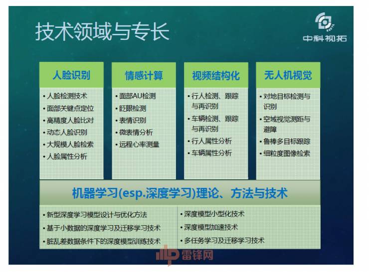 我们主要的底层技术,就是在机器学习特别是深度学习理论、方法与技术。基于这些机器学习的方法,在人脸识别、情感计算、视频结构化和无人机视觉等方面,我们有自己的一些布局。我们过去的积累包括在这些领域的竞赛中,取得一些最好的成绩,其中包括人脸识别、手势识别、行人检测、图像搜索等等任务。我们刚才也提到,业界已经有像商汤、Face++等等有很多前辈公司,比我们早走了多年。我们在商业模式上也希望不断探索新的路径。当前阶段,我们采取”开源赋能“的差异化做法与一些重点客户开展了深度合作。