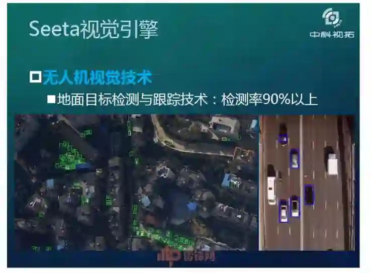 我们还有一个方向是在做无人机视觉,能够实现地面车辆目标检测,以及地面车辆的实时跟踪。左图是地面车辆目标检测。每个绿框都是我们检测出来的车辆。我们特意选了一个堵车的场景,在目标如此小且密集的情况下,人为识别都是有很多困难的,但我们的算法能够实现接近90%精度的检测。右边的视频是实现跟踪,能够实现对地面上车辆的实时跟踪。