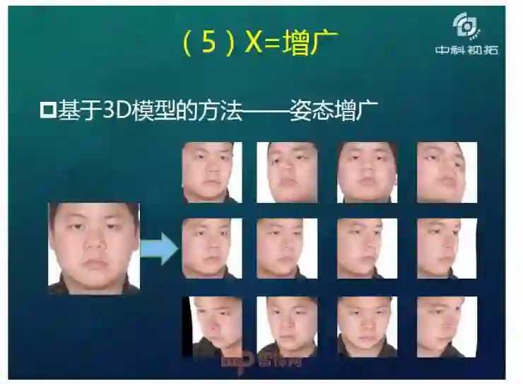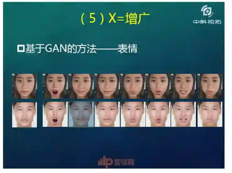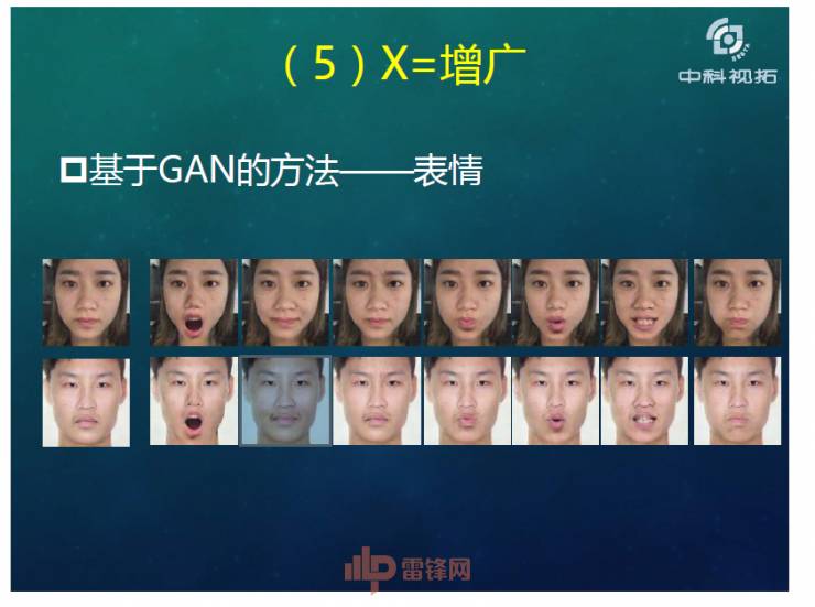 完成这个任务,另外一种方法是采用这两年非常火的GAN方法。输入最左侧的照片,用GAN可以生成不同表情的照片。还可以有更加复杂的,比如说带上眼镜,加上胡子等等。当然这个也是有条件的,并不是说每张照片都可以做得这么好,基于GAN生成的人脸图像是不是能够用于提升算法,目前还是存疑的。