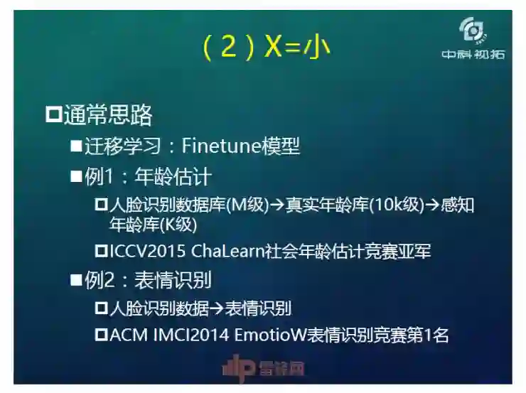 最通常的思路是做迁移学习,所谓迁移学习最简单的是做Finetune,我们把一个已经训练好的模型,再用小量的数据做调整和优化,使得它适应这些小数据所代表的应用场景。例如:我们在2015年参加感知年龄估计的竞赛并取得了亚军。我们采用的算法是首先在人脸识别的数据库里面,利用百万级的数据做训练,再用几万量级真实年龄的数据做Finetune,最后在竞赛方提供的感知年龄的测试数据集上,取得了非常好的效果。