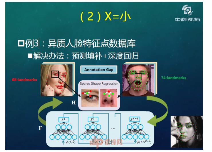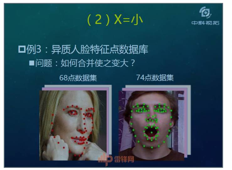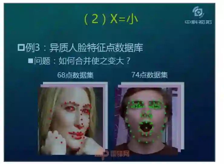 另外一个例子,比如面部特征点定位,要用到在面部标注点的数据集。现在学术界或者工业界可能会有很多不同类型的数据,比如一个数据集可能是68个点、另外一个数据集是74个点,它们之间的定义是不一样的,如何把它合并起来,使它变大,从而形成更好的算法,也是一个很值得关注的方向。