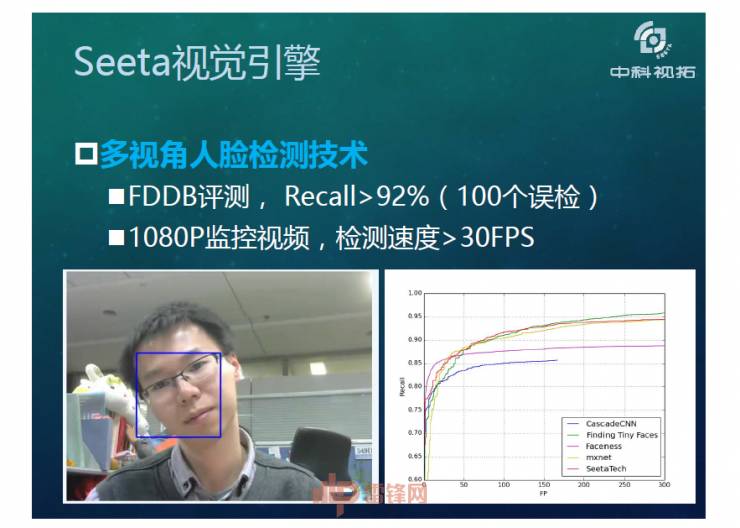 在人脸检测方面实现多姿态的检测,在FDDB上是最好的方法之一。其实人脸检测大家都非常熟悉,就是我们把这个画面有多少个人脸找出来。FDDB也是在这个领域里面被广泛采用的标准评测,我们在100个误检时达到了接近93%的检测率。另外,我们还实现了很多加速的方法,实现人脸的快速检测,包括在一些嵌入式设备上实现实时的检测。