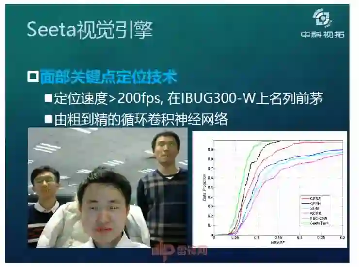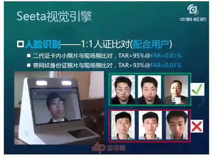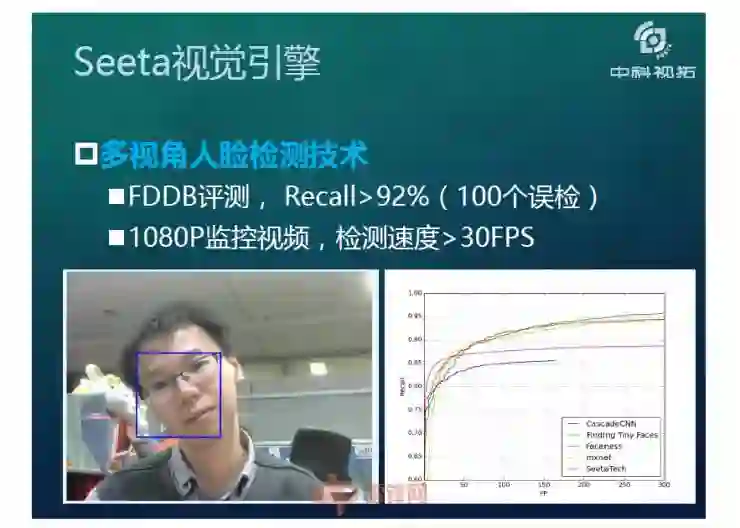人脸识别:SeetaVision的多姿态人脸检测技术是在标准人脸检测评测集FDDB上最好的方法之一。在100个误检的情况下,SeetaVision的检测率达到了92%。此外还研发了检测加速技术,从而可以在嵌入式设备上实现实时的多姿态人脸检测。第二个人脸核心技术是面部关键特征点的定位,SeetaVision实现了81个关键特征点的超实时检测与跟踪。SeetaVison人脸识别具体应用包括人证一致性验证,员工考勤与打卡、黑白名单目标人检测等。