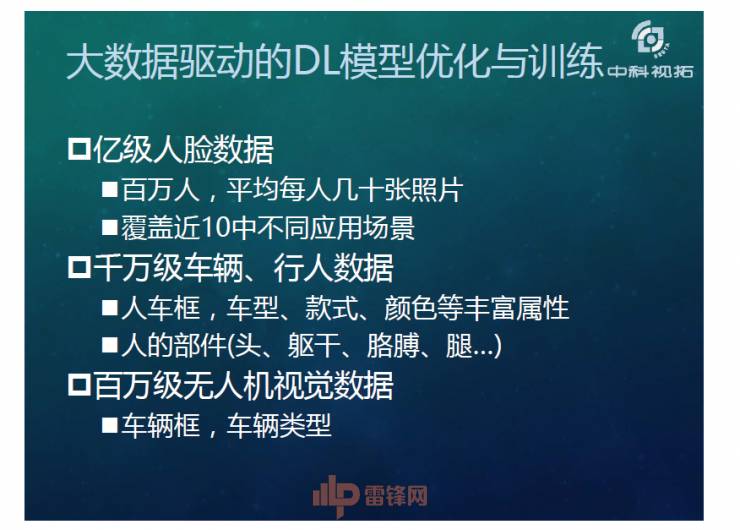 第一,X=大,就是大数据驱动的视觉引擎的设计。现在,无论大公司还是小公司,都是在拼命的收集数据,进行深度学习模型的优化和训练。我们在人脸方面有百万级人数的亿级人脸数据,每个人又进一步有很多不同的场景和照片。我们在车辆和行人方面也有千万量级的图像和视频,我们对这些数据做了大量的标注,如:人的头部、躯干和四肢的标注信息。在无人机视觉方面,我们大概三四个月时间,就积累了百万量级的无人机视觉数据,可以实现对车辆目标以及车辆类型的检测和估计。在大数据的条件下,类似于人的熟能生巧和见多识广,见得多你就可以积累出来非常多的经验。