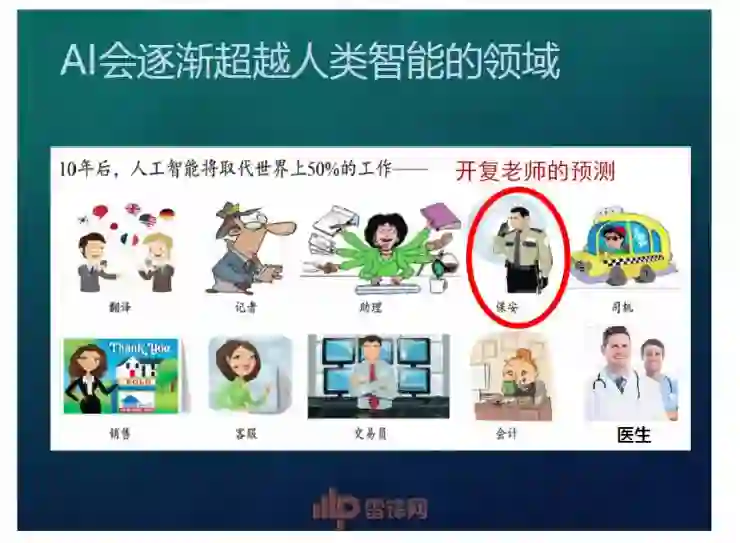 李开复老师在过去一段时间多次提及,在未来10年可能人工智能会取代10种职业50%的工作。我不知道大家怎么去看,我个人觉得保姆可能还是很难取代的,也许医生更有可能会被取代。从我们做计算机视觉的角度来讲,医疗读图是一个很重要的方向。对于做人脸识别或者图像识别的人来说,保安则是我们更感兴趣的群体,在未来10年,也许不是50%,而是80%的保安,会被一些自动的系统所取代。比如说我们的一个企业客户,用我们的人脸识别技术做单位的门禁和考勤,在1万个员工的情况下,可以实现不需要员工卡自动做识别、开门和考勤的系统,我想可能未来真的不需要一个保安坐在那儿了。