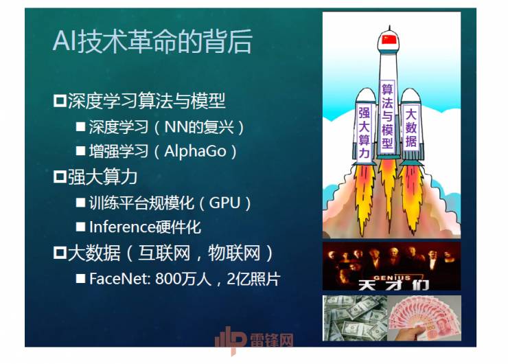 其实我们大家都非常深切的体会到,我们正在邂逅一场前所未有的人工智能技术革命和应用的井喷。在这样的一个状态下,它的背后是有“三驾马车”或者“三个引擎”,就是深度学习算法、强大算力以及大数据,这些因素的共同作用才产生了这一轮新的AI热潮。