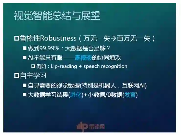 其一,鲁棒性可能是AI和视觉智能一个最致命的问题。其二,AI的成长需要多模态协同,不能单靠视觉智能或语音智能等。其三,如何基于小数据甚至是零数据准确完成各类视觉任务,还需要大量的深入研究。