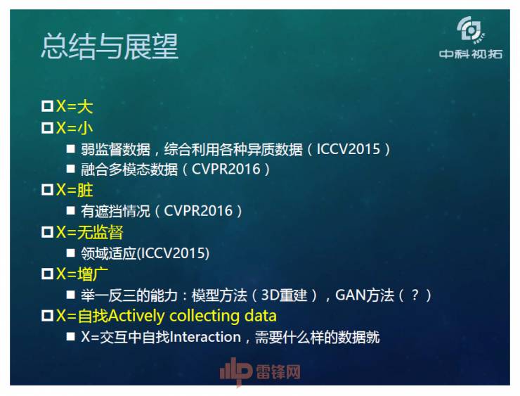 关于演讲主题中的X表示什么意思,山世光博士在接下来的演讲中给出了X数据的五个含义,分别是:第一,大数据;第二,小数据;第三,脏数据;第四,无监督数据;第五,是增广,通过增广获得更大的数据集。下面的分享实录中会有对各个含义的详细解读。