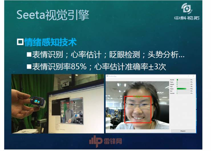 情感计算:SeetaVision的基本表情识别率超过85%,基于普通摄像头的心率估计也非常接近医疗设备的检测结果。