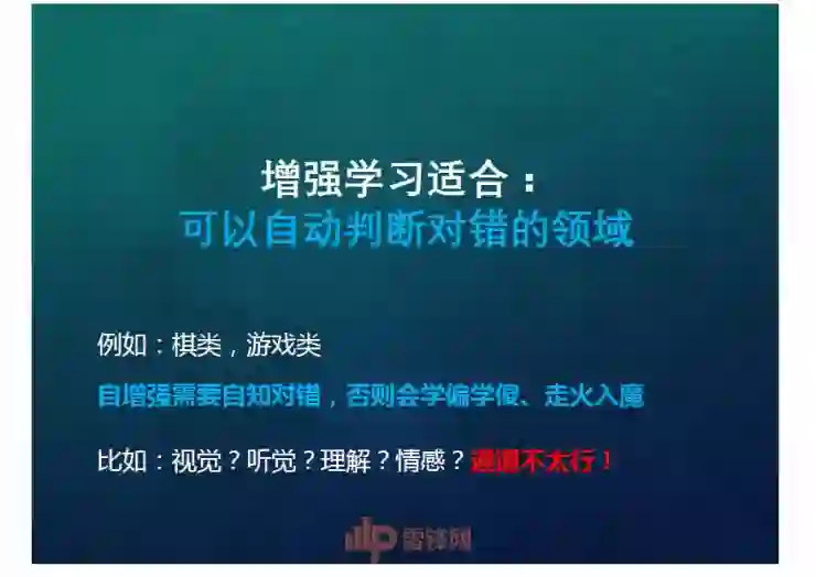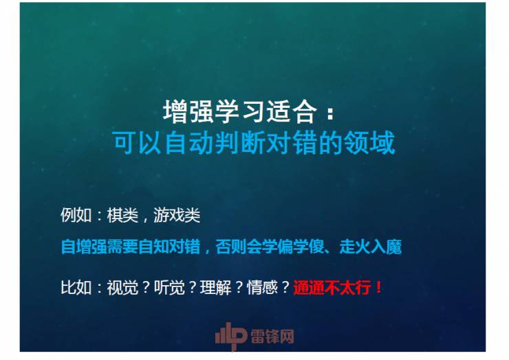 所以增强学习在这些问题上并没有得到非常好的应用。深度学习目前适合解决我称之为“好数据肥沃”的领域,而且通常只对应于人类学习方法里的归纳学习。然而,人类的学习除了归纳学习之外,还有演绎推理。针对演绎推理,深度学习则存在严重短板。举个演绎推理的例子,比如说《几何原本》,是欧几里德从5条公理推演出来的。想用深度学习做这类自动推演,目前来看是完全没有希望的。当然,这是一个很极端的例子,但我们在日常生活中是需要大量推理的,深度学习在这一点上,目前来看也没有太多可以有作为的地方。