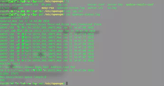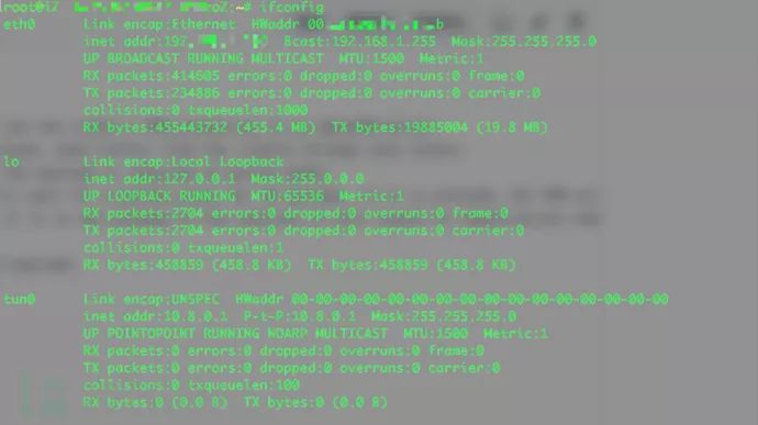 服务端脚本安装完成后会在本地生成一个虚拟网卡tun0,默认地址为10.8.0.1,如果客户端连接后,分配的客户端地址会依次分发为10.8.0.2/3等。