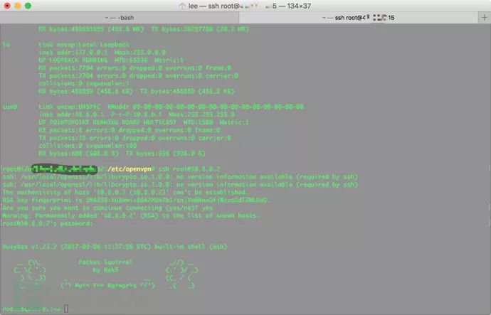 如上图所示,此时我们就可以在VPS上直接SSH root@10.8.0.2 对Packet Squirrel进行远程访问。