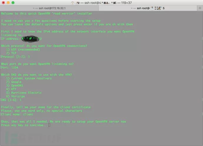 openVPN服务端安装脚本采取一系列交互式完成安装,其中IP address为我们VPS公网IP,推荐使用openVPN协议类型为UDP,端口1194,其他保持默认即可。