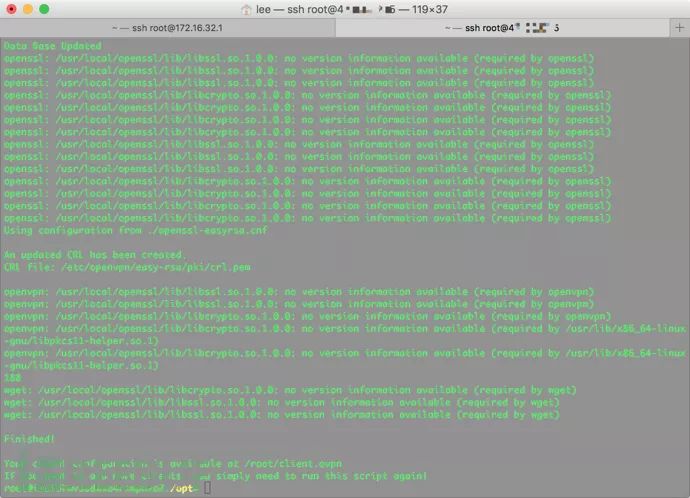 经过大约几分钟的安装过程,会在服务器/root目录下生成client.ovpn文件,其中包含了openVPN的服务端配置信息以及密钥等。