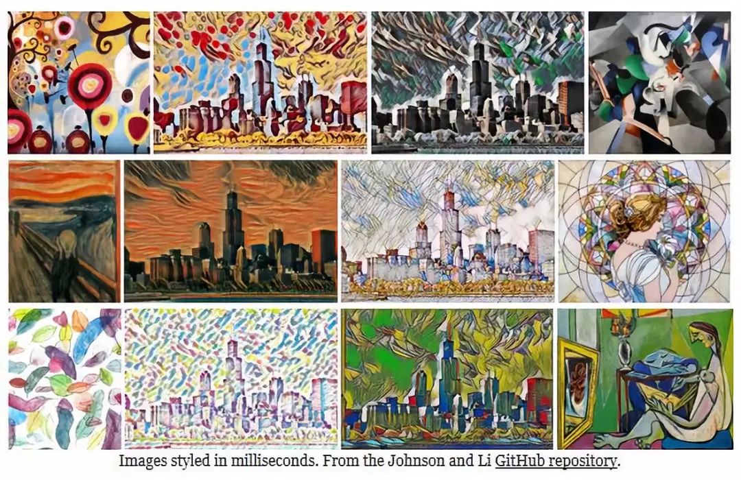 Johnson等人使用微软的 COCO 数据集对图像变换网络进行训练,输出不同的图片风格(比如梵高的《星空》)。由这个网络产生的图片与之前的论文的结果几乎一致,但是在生成 500 张 256*256 像素的图片的任务中竟有 1060 倍的速度的提升。每张照片的生成只需要50ms: