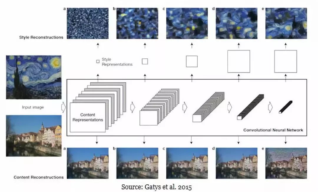 那么,如何推导和生成内容误差和风格误差(Content loss&Style loss)这两个函数呢?要解决这个问题,首先需要使用数学的方式对内容和风格(Content&Style)进行定义。Gatys、Ecker、Bethge在他们的标志性的风格迁移论文对这个问题进行了解答,并使用卷积神经网络(CNNs)定义了这些函数。