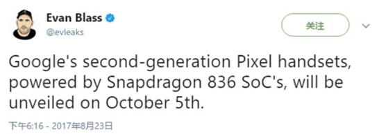 紧接着在今天上午,爆料大神evleaks在推特表示,下一代Pixel手机定于10月5日发布,搭载骁龙836芯片。