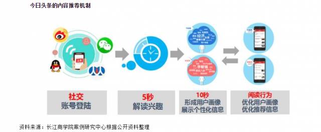 其具体做法是,自己不进行内容生产,而是积极整合技术优势,为内容提供稳定、高效的“出路”,即依托数据挖掘和个性化算法搭建起一个内容聚合与推荐平台,以用户需求和偏好为导向,通过为已有的资讯内容进行精准推送、个性化传播,实现利润转化。
