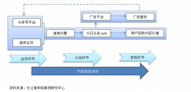 2014年6月,张一鸣对外宣布今日头条已经找到了变现模式,同时推出了媒体平台--“头条号”,开始把产业链延伸至内容生产环节。由此,从内容生产到内容分发,再到营收变现,今日头条构建了一个基于“机器学习、大数据挖掘,构建精准、高效的内容分发模式”为核心的独立、新型的内容生态体系。