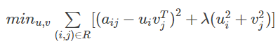 R表示用户和物品集,aij表示用户i对物品j的真实评分,lambda表示正则化系数,lambda后面的表示防止过拟合的正则化项。