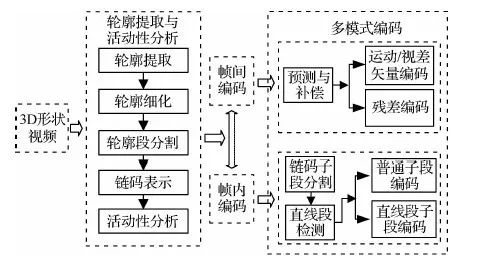 对于给定的3D视频形状序列逐帧进行对象轮廓提取并预处理后, 进行对象轮廓活动性分析, 将形状图像分成帧内模式编码图像和帧间预测模式编码图像。
