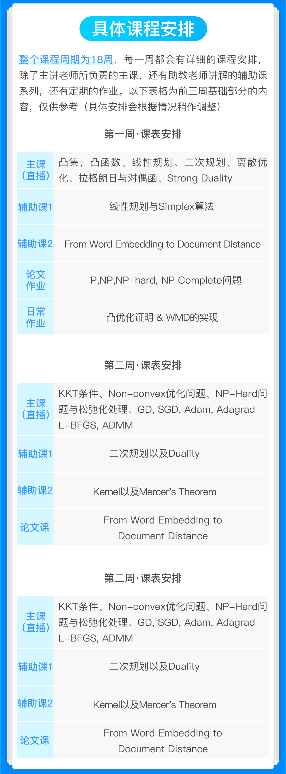采用直播的授课方式,一周4-5次的直播教学, 包括2次的main lectures, 1-2次的discussion session (讲解某一个实战、必备基础、案例或者技术上的延伸), 1次的paper reading session (每周会assign一篇必备论文,并且直播解读)。教学模式上也参考了美国顶级院校的教学体系。以下为其中一周的课程安排,供参考。