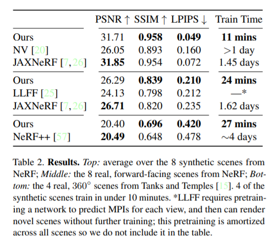他们提供了一个定制的 CUDA 实现,利用模型的简单性来达到可观的加速。在有界场景中,Plenoxels 在单个 Titan RTX GPU 上的典型优化时间是 11 分钟,NeRF 大约是一天,前者实现了 100 多倍的加速;在无界场景中,Plenoxels 的优化时间大约为 27 分钟,NeRF++ 大约是四天,前者实现了 200 多倍的加速。虽然 Plenoxels 的实现没有针对快速渲染进行优化,但它能以 15 帧 / 秒的交互速率渲染新视点。如果想要更快的渲染速度,优化后的 Plenoxel 模型可以被转换为 PlenOctree(本文作者 Alex Yu 等在一篇 ICCV 2021 论文中提出的新方法:https://alexyu.net/plenoctrees/)。