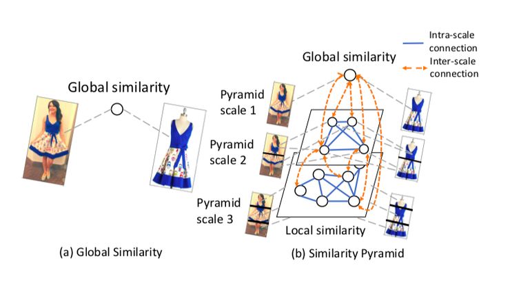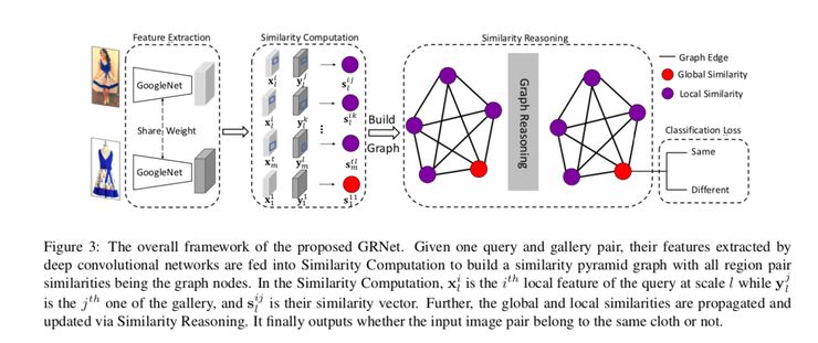 为了解决此问题,作者提出了一种基于相似金字塔的新的图论网络(GRNet),该算法通过使用多个比例的全局和局部表示来学习查询和图库之间的相似性。相似度金字塔由相似度图(Graph of similarity)表示,其中节点表示不同比例的服装组件之间的相似度,并且最终匹配分数是通过沿边缘传递的消息获得的。