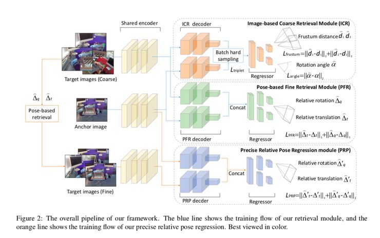 为此,作者提出了一种基于粗糙到精细(coarse-to-fine retrieval)检索的深度学习框架。该框架包括三个步骤:1)基于图像的粗糙检索;2)基于姿势的精细检索;3)精确的相对姿势回归。