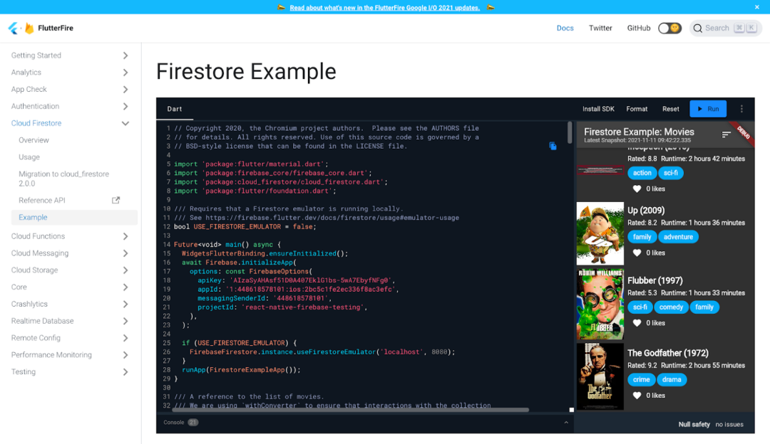 在上面的示例中,您可以看到 Cloud Firestore 的文档和示例应用的代码,您可以直接在浏览器中运行和编辑这些代码,而无需安装内容、创建测试项目,甚至不需要复制/粘贴代码。代码已经在页面中就绪,可以立即使用。