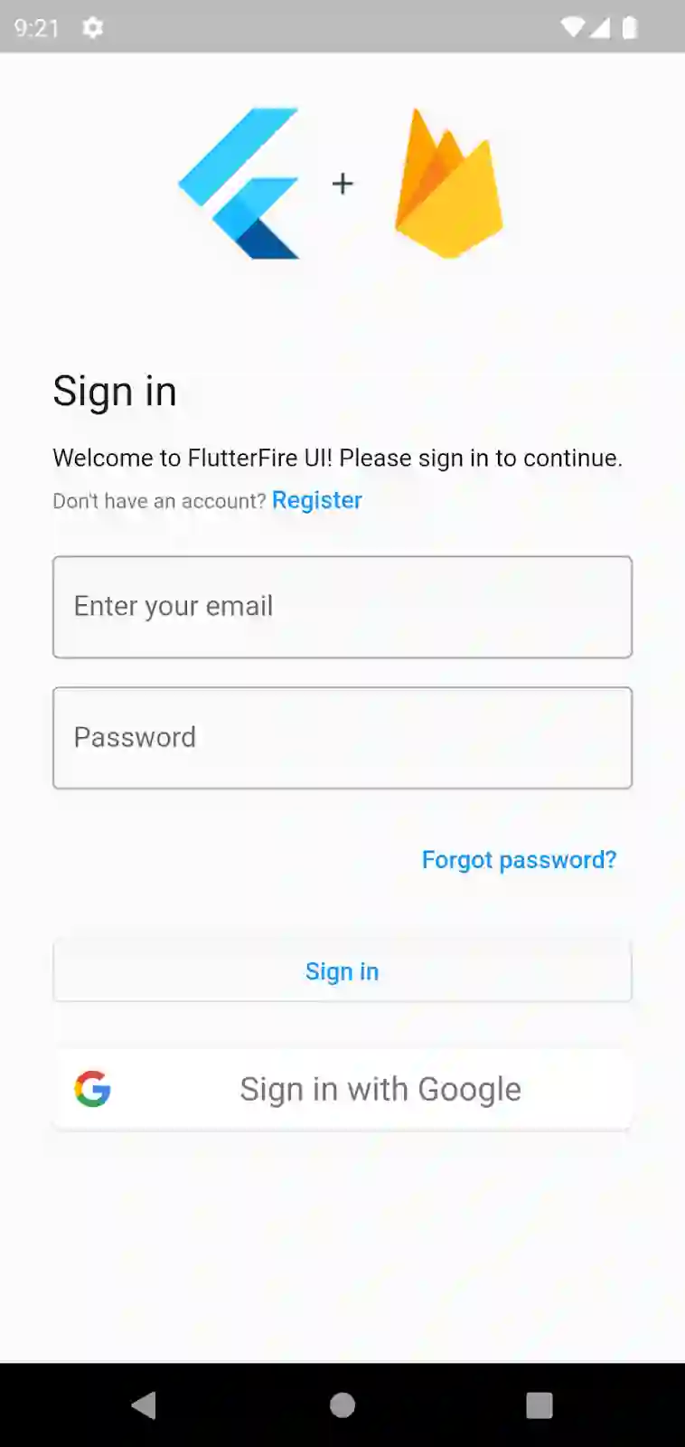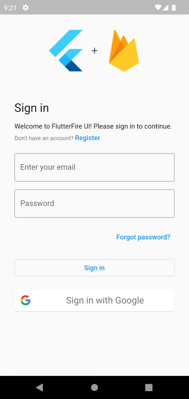import 'package:flutter/material.dart';import 'package:firebase_core/firebase_core.dart';import 'package:firebase_auth/firebase_auth.dart';import 'package:flutterfire_ui/auth.dart';import 'firebase_options.dart';Future<void> main() async {WidgetsFlutterBinding.ensureInitialized();await Firebase.initializeApp(options: DefaultFirebaseOptions.currentPlatform);runApp(MyApp());}class MyApp extends StatelessWidget {const MyApp({Key? key}) : super(key: key);Widget build(BuildContext context) => MaterialApp(home: AuthenticationGate(),);}class AuthenticationGate extends StatelessWidget {const AuthenticationGate({Key? key}) : super(key: key);Widget build(BuildContext context) => StreamBuilder<User?>(stream: FirebaseAuth.instance.authStateChanges(),builder: (context, snapshot) {// User is not signed in - show a sign-in screenif (!snapshot.hasData) {return SignInScreen(providerConfigs: [EmailProviderConfiguration(),GoogleProviderConfiguration(clientId: 'xxxx-xxxx.apps.googleusercontent.com',),],);}return HomePage(); // show your app’s home page after login},);}