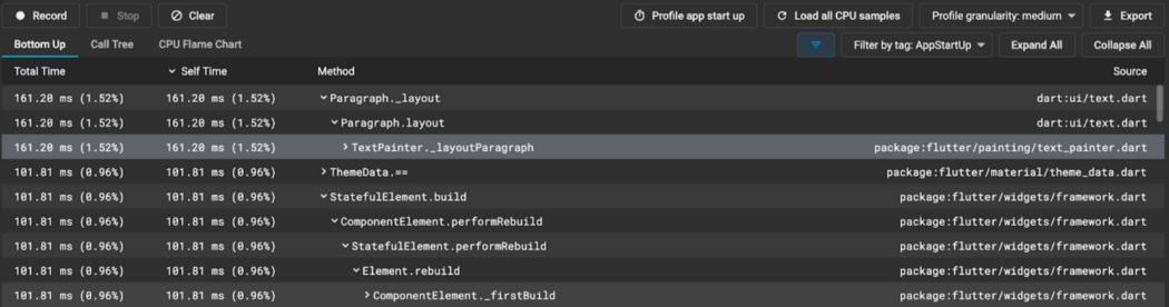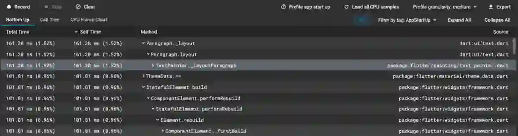 另外,此版本的 DevTools 添加了新功能来分析应用启动时的性能表现。此剖析文件包含从 Dart VM 初始化到第一个 Flutter 帧渲染完成的所有 CPU 采样。在点击 "剖析应用启动 (Profile app starup)" 按钮并加载应用启动剖析文件后,您将看到剖析文件的 "AppStartUp" 用户标签已被选中。您还可以通过在列表中选择这个用户标签过滤器 (如果可用),来加载应用启动剖析文件。选择此标签会显示您应用启动的剖析数据。