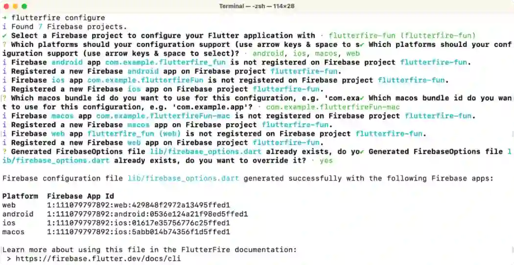要收集每个平台初始化选项数据结构的数据,请使用新的 flutterfire CLI 工具: