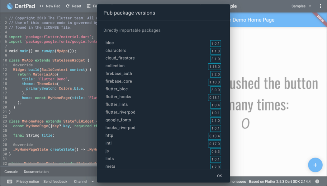 完整的 Flutter 版本发布必然涉及工具方面的改进。在此版本中,DartPad 最大的改进是对更多 package 的支持。事实上,现在支持导入的 package 达到了 23 个。除了对几个 Firebase 服务的支持外,还支持 bloc、characters、collection、google_fonts 和 flutter_riverpod 等流行的 package。DartPad 团队将继续增加新的 package,如果您想查看目前支持哪些 package,可以点击下方截图右下角的信息图标: