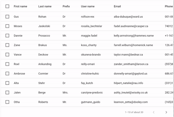 class FirestoreTableStory extends StatelessWidget {FirestoreTableStory({Key? key}) : super(key: key);// live Firestore queryfinal usersCollection = FirebaseFirestore.instance.collection('users');Widget build(BuildContext context) {return FirestoreDataTable(query: usersCollection,columnLabels: const {'firstName': Text('First name'),'lastName': Text('Last name'),'prefix': Text('Prefix'),'userName': Text('User name'),'email': Text('Email'),'number': Text('Phone number'),'streetName': Text('Street name'),'city': Text('City'),'zipCode': Text('Zip code'),'country': Text('Country'),},);}}