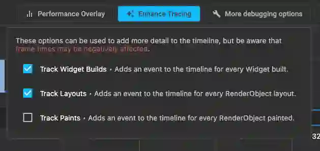 启用任一跟踪功能时,时间轴将根据选项相应地包含新的 "已构建 widget"、"已布局渲染对象" 和 "已绘制渲染对象" 事件。