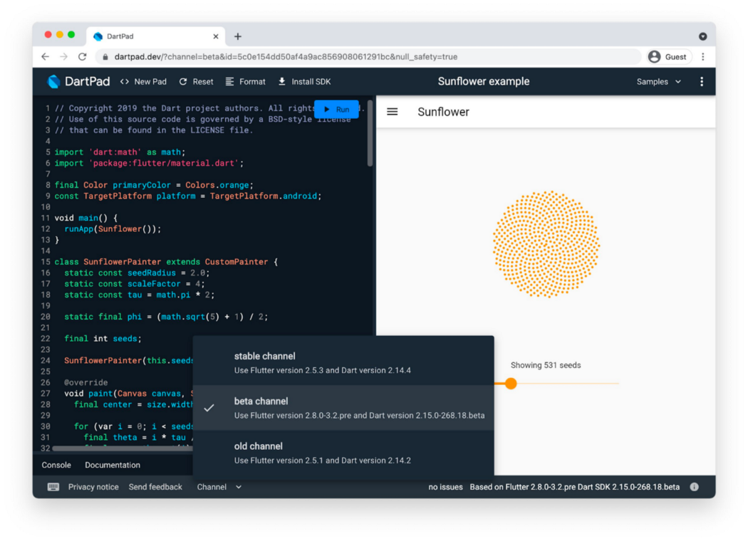 DartPad 还有一个相当实用的新特性。此前,DartPad 一直运行最新的稳定版本。在这个版本中,您可以让 DartPad 使用最新的 beta 版或上一个稳定版本 (称为 "旧渠道"),只需使用状态栏中新增的渠道 (Channel) 菜单切换即可。