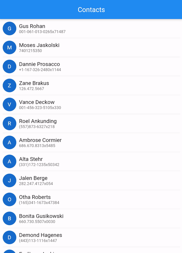 class UserListView extends StatelessWidget {UserListView({Key? key}) : super(key: key);// live Firestore queryfinal usersCollection = FirebaseFirestore.instance.collection('users');Widget build(BuildContext context) => Scaffold(appBar: AppBar(title: const Text('Contacts')),body: FirestoreListView<Map>(query: usersCollection,pageSize: 15,primary: true,padding: const EdgeInsets.all(8),itemBuilder: (context, snapshot) {final user = snapshot.data();return Column(children: [Row(children: [CircleAvatar(child: Text((user['firstName'] ?? 'Unknown')[0]),),const SizedBox(width: 8),Column(crossAxisAlignment: CrossAxisAlignment.start,mainAxisAlignment: MainAxisAlignment.center,mainAxisSize: MainAxisSize.min,children: [Text('${user['firstName'] ?? 'unknown'} ''${user['lastName'] ?? 'unknown'}',style: Theme.of(context).textTheme.subtitle1,),Text(user['number'] ?? 'unknown',style: Theme.of(context).textTheme.caption,),],),],),const Divider(),],);},),);}