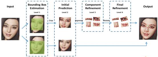 Face++版 DCNN 首次利用卷积神经网络进行 68 个人脸关键点检测,针对以往人脸关键点检测受人脸检测器影响的问题,作者设计 Level-1 卷积神经网络进一步提取人脸边界框,为人脸关键点检测获得更为准确的人脸位置信息,最终在当年 300-W 挑战赛上获得领先成绩。