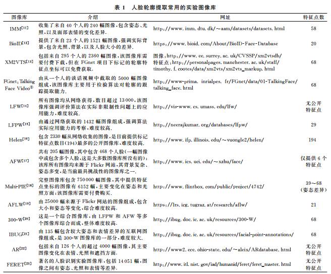 传统人脸关键点检测数据库为室内环境下采集的数据库,比如 Multi-pie、Feret、Frgc、AR、BioID 等人脸数据库。而现阶段人脸关键点检测数据库通常为复杂环境下采集的数据库.LFPW 人脸数据库有 1132 幅训练人脸图像和 300 幅测试人脸图像,大部分为正面人脸图像,每个人脸标定 29 个关键点。AFLW 人脸数据库包含 25993 幅从 Flickr 采集的人脸图像,每个人脸标定 21 个关键点。COFW 人脸数据库包含 LFPW 人脸数据库训练集中的 845 幅人脸图像以及其他 500 幅遮挡人脸图像,而测试集为 507 幅严重遮挡(同时包含姿态和表情的变化)的人脸图像,每个人脸标定 29 个关键点。MVFW 人脸数据库为多视角人脸数据集,包括 2050 幅训练人脸图像和 450 幅测试人脸图像,每个人脸标定 68 个关键点。OCFW 人脸数据库包含 2951 幅训练人脸图像(均为未遮挡人脸)和 1246 幅测试人脸图像(均为遮挡人脸),每个人脸标定 68 个关键点。