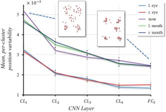 作者对 Vanilla CNN 中间各层特征进行聚类分析,并统计出关键点在各层之间的变化程度,如图所示: