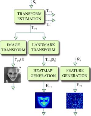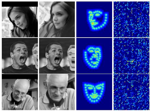 从第一阶段开始讲起,第一阶段的输入仅有原始图片和 S0。面部关键点的初始化即为 S0,S0 是由所有关键点取平均得到,第一阶段输出 S1。对于第二阶段,首先,S1 经第一阶段的 CONNECTION LAYERS 进行转换,分别得到转换后图片 T2(I)、S1 所对应的热图 H2 和第一阶段 fc1 层输出,这三个正是第二阶段的输入。如此周而复始,直到最后一个阶段输出 SN。文中给出在数据集 IBUG 上,经过第一阶段后的 T2(I)、T2(S1)和特征图,如图所示: