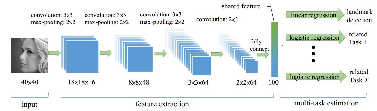 网络输出为 40*40 的灰度图,经过 CNN 最终得到 2*2*64 的特征图,再通过一层含 100 个神经元的全连接层输出最终提取得到的共享特征。该特征为所有任务共同享用,对于关键点检测问题,就采用线性回归模型;对于分类问题,就采用逻辑回归。