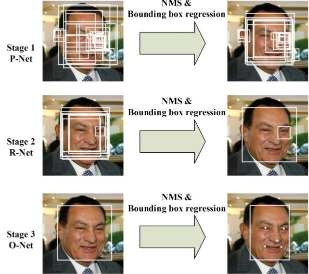 MTCNN 实现人脸检测和关键点定位分为三个阶段。首先由 P-Net 获得了人脸区域的候选窗口和边界框的回归向量,并用该边界框做回归,对候选窗口进行校准,然后通过非极大值抑制(NMS)来合并高度重叠的候选框。然后将 P-Net 得出的候选框作为输入,输入到 R-Net,R-Net 同样通过边界框回归和 NMS 来去掉那些 false-positive 区域,得到更为准确的候选框;最后,利用 O-Net 输出 5 个关键点的位置。